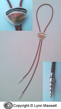 Bolo tie, fabricated silver, jasper, bloodstone, leather, pendant 2" x 1.5" |