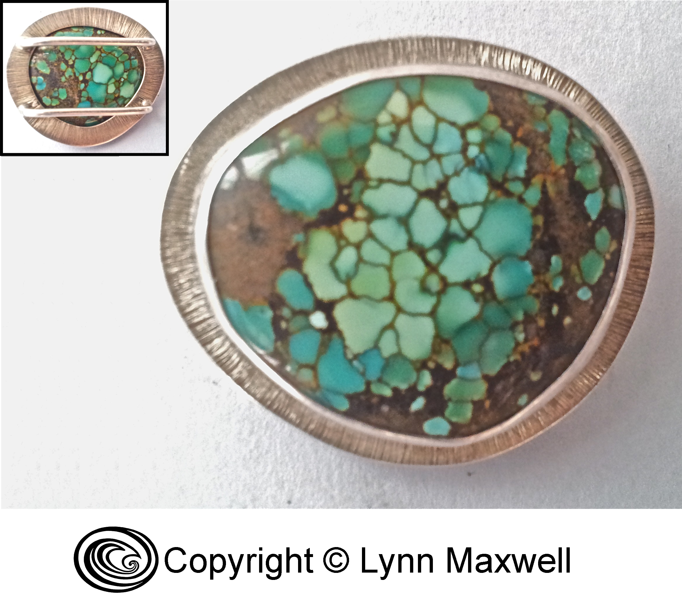Ring, fabricated silver, lapis, 0.75" | Scarf holder, fabricated silver, turquoise, 1.5" | |||